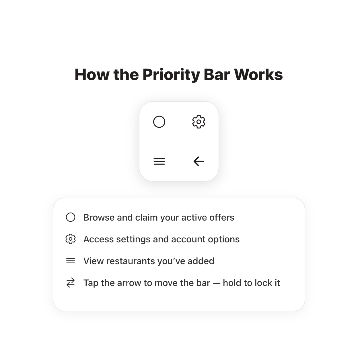 In the Offers Tab you can see all offers from the restaurants you have added. To claim, swipe left! Claim any that are cluttering your space!