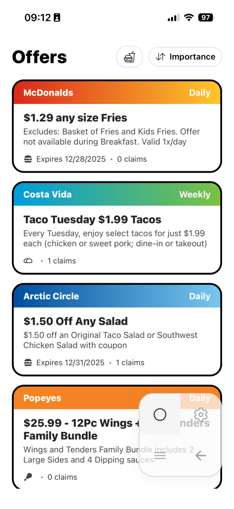 We don’t partner with restaurants yet, so offers aren’t redeemed through the app. Claiming an offer simply marks it as used and removes it from your feed.