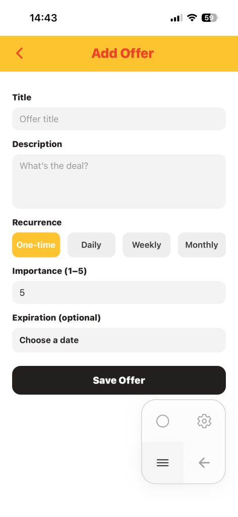 In the selected Restaurants view, click the “+” icon to add an offer. This form will pop up.