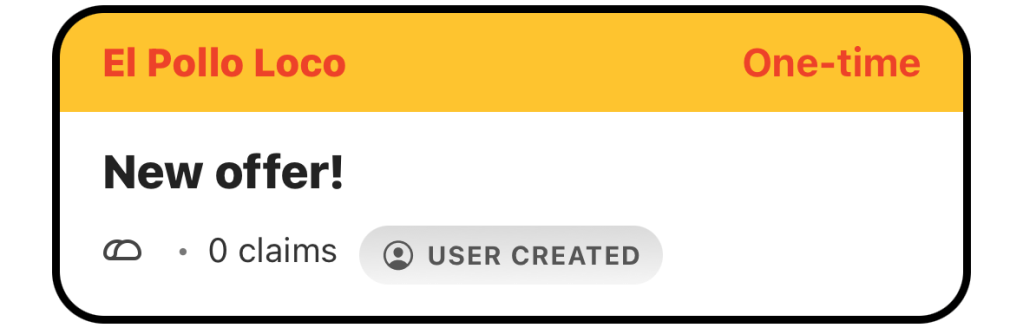 User created offers have a special pill icon on the bottom of the card. This grants the ability to swipe right on the card to edit the offer incase you made a mistake!